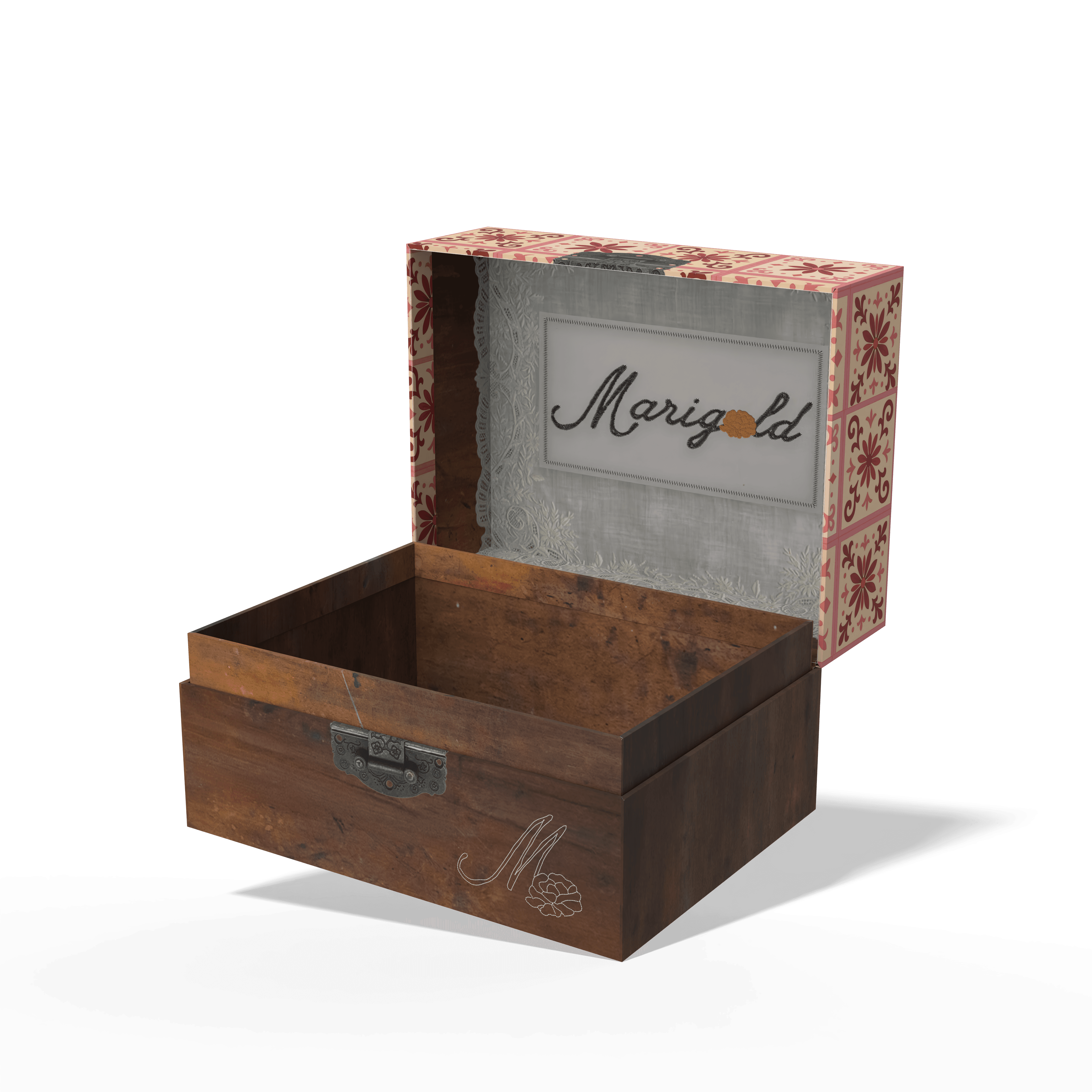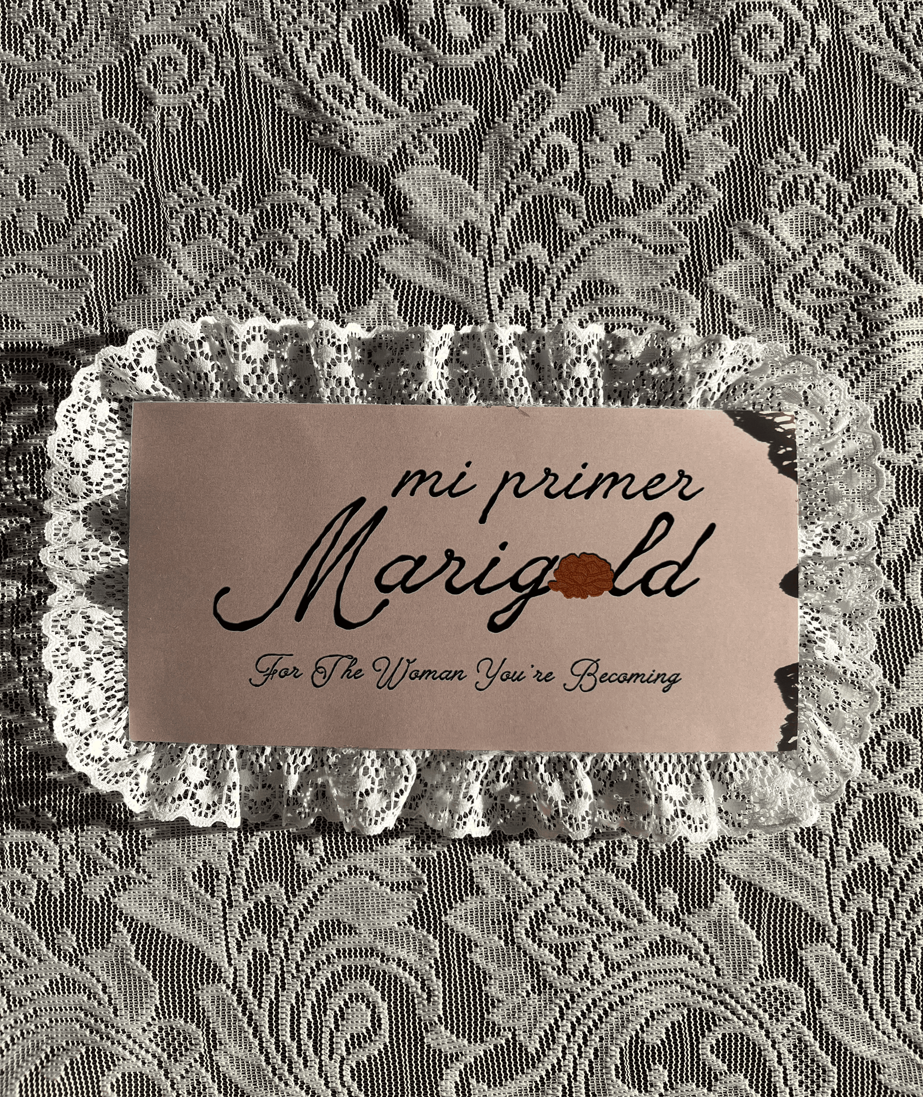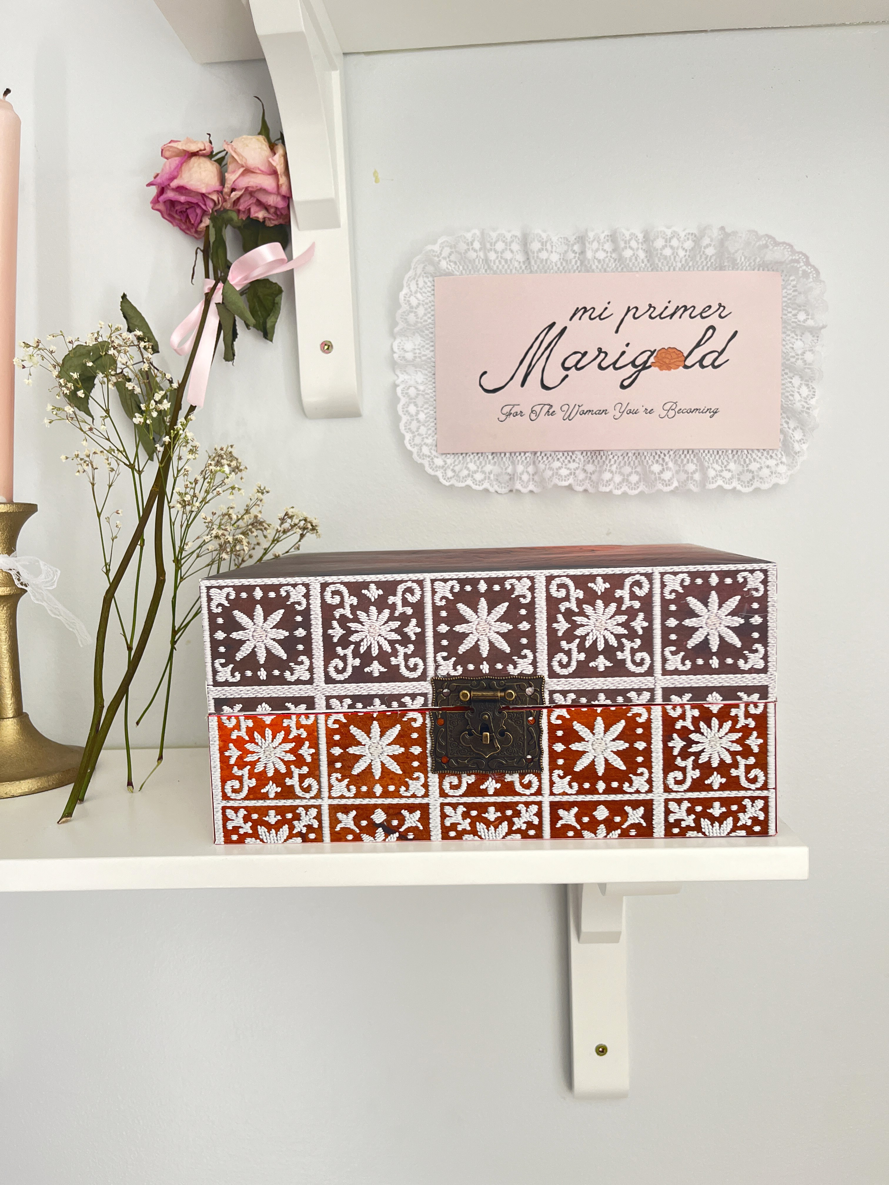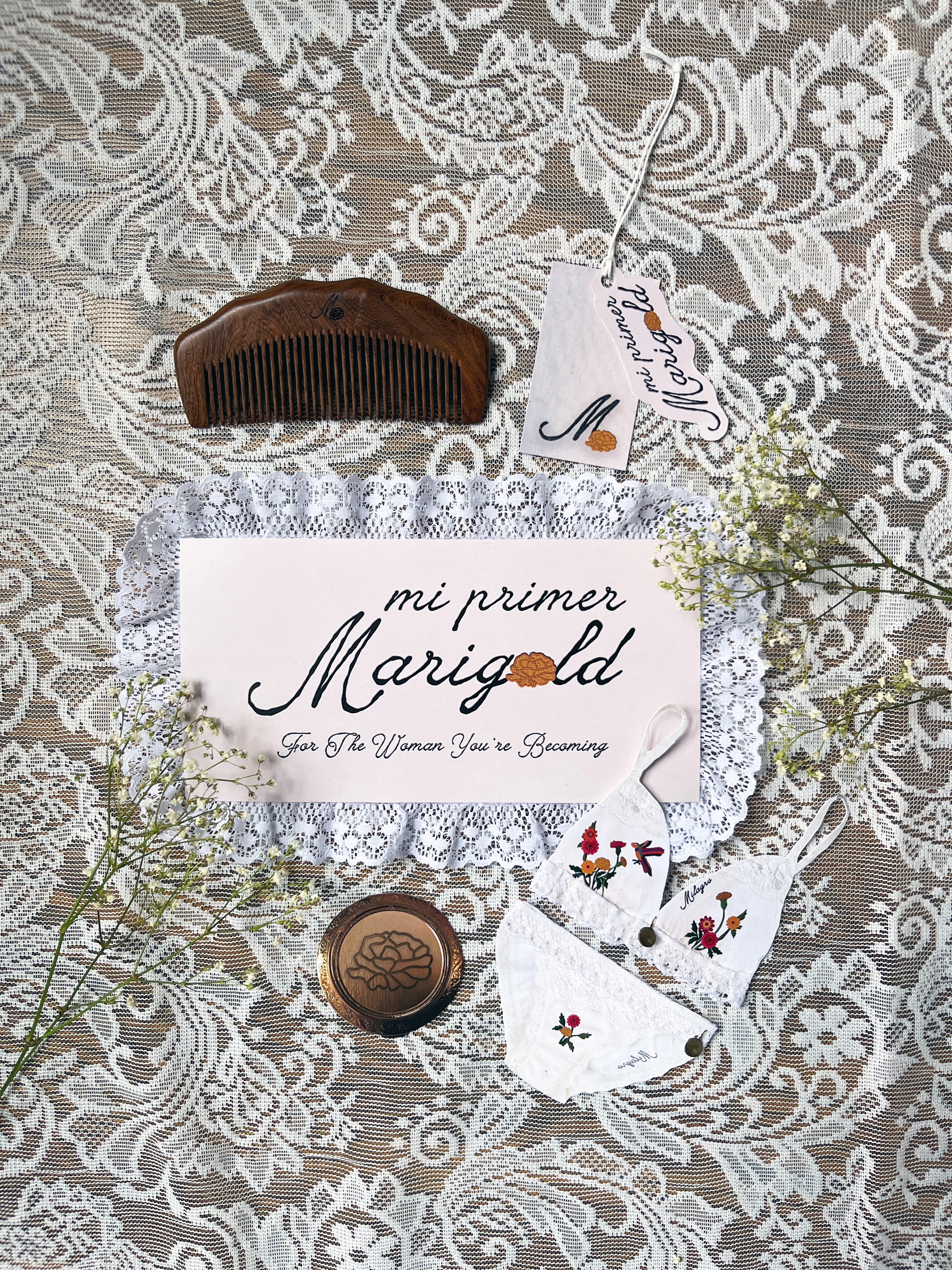 The final packaging embraces a vintage, rustic Mexican aesthetic, drawing from the look and feel of traditional keepsake chests. The Marigold logo is placed at the top alongside the phrase “for the woman you’re becoming,” keeping the branding subtle so the piece feels more personal—like something meant to be held onto rather than displayed.