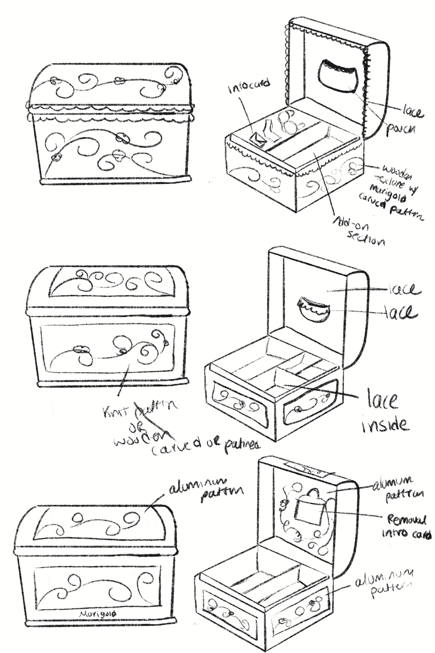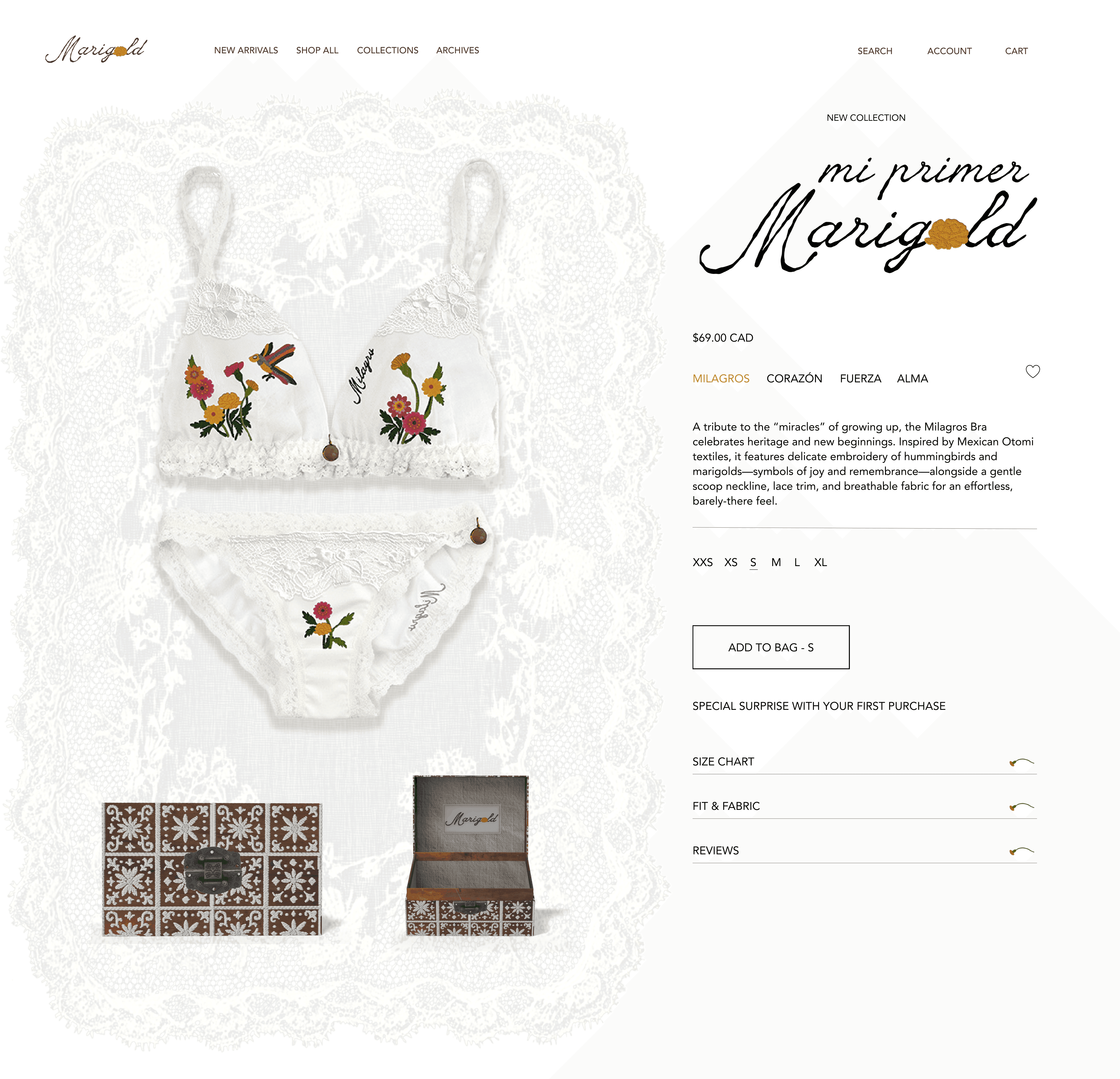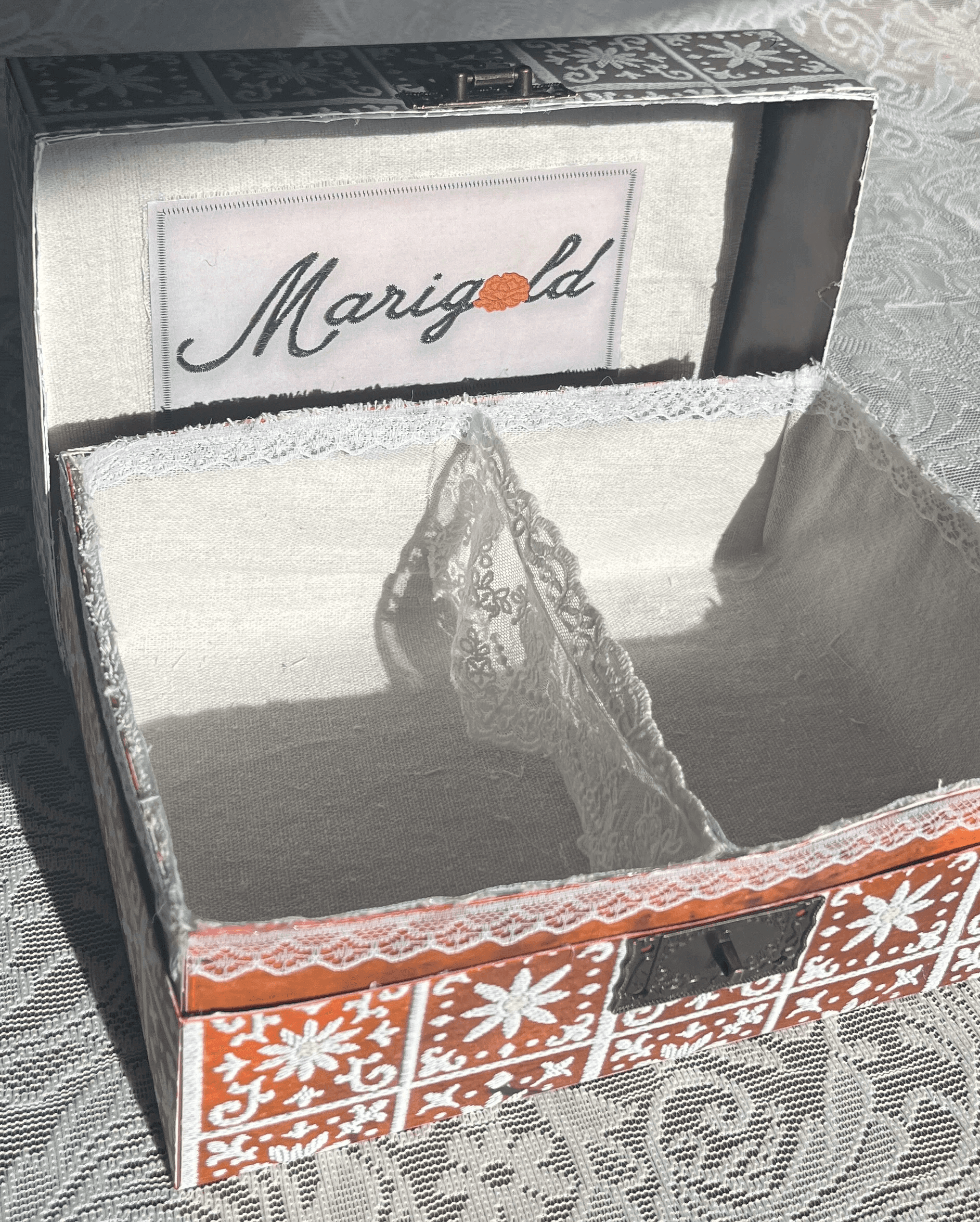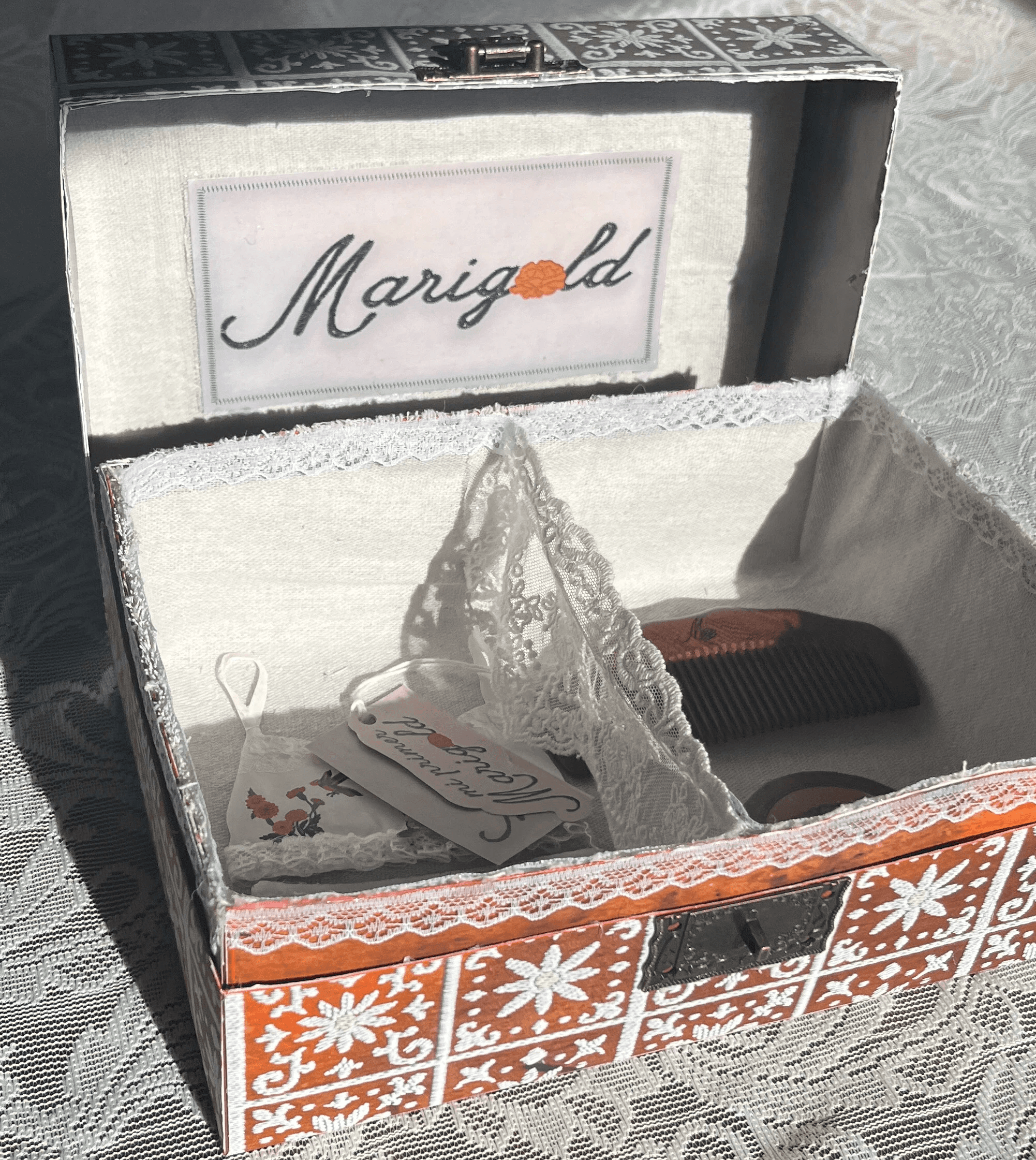 The final packaging embraces a vintage, rustic Mexican aesthetic, drawing from the look and feel of traditional keepsake chests. The Marigold logo is placed at the top alongside the phrase “for the woman you’re becoming,” keeping the branding subtle so the piece feels more personal—like something meant to be held onto rather than displayed.