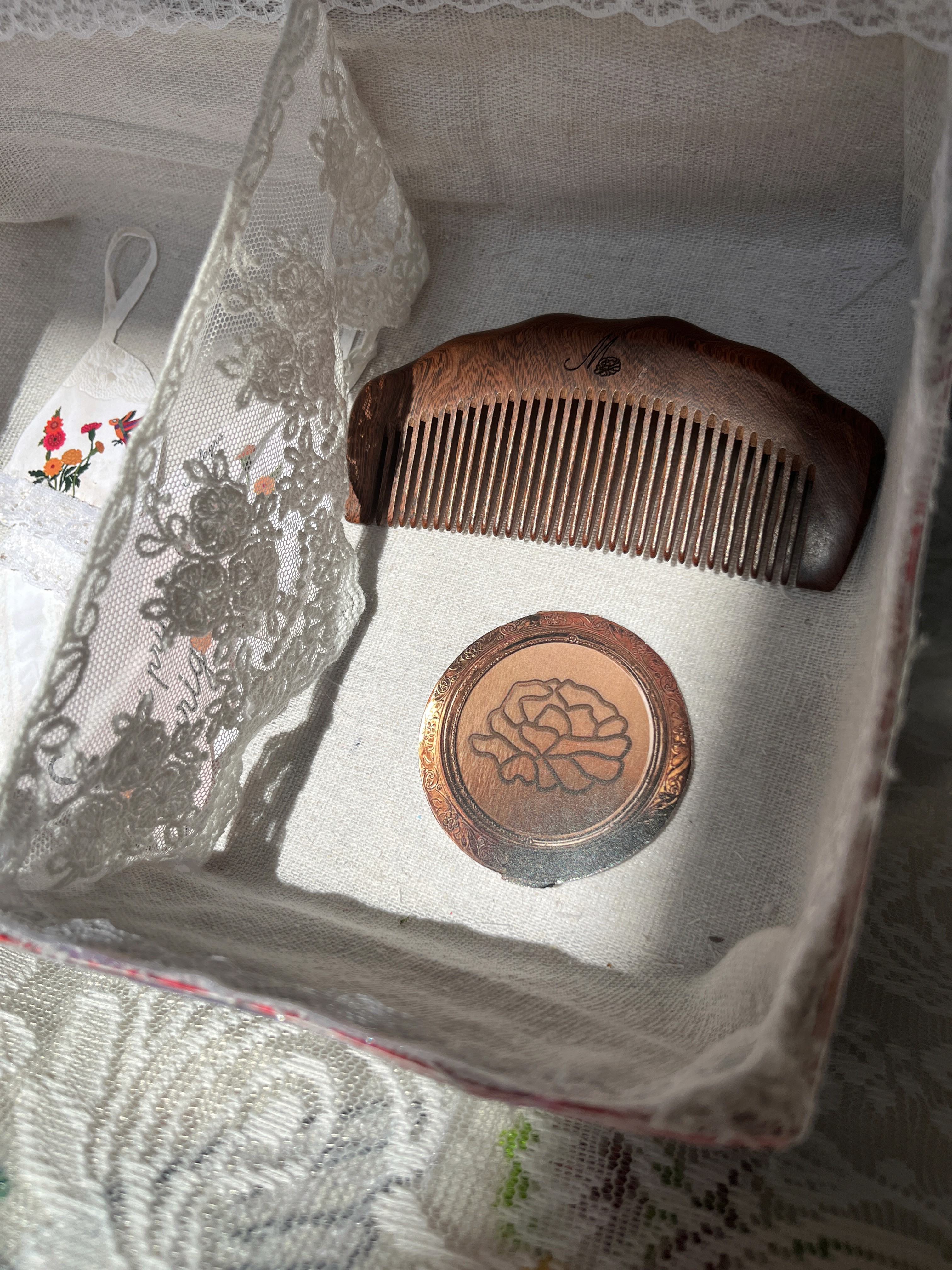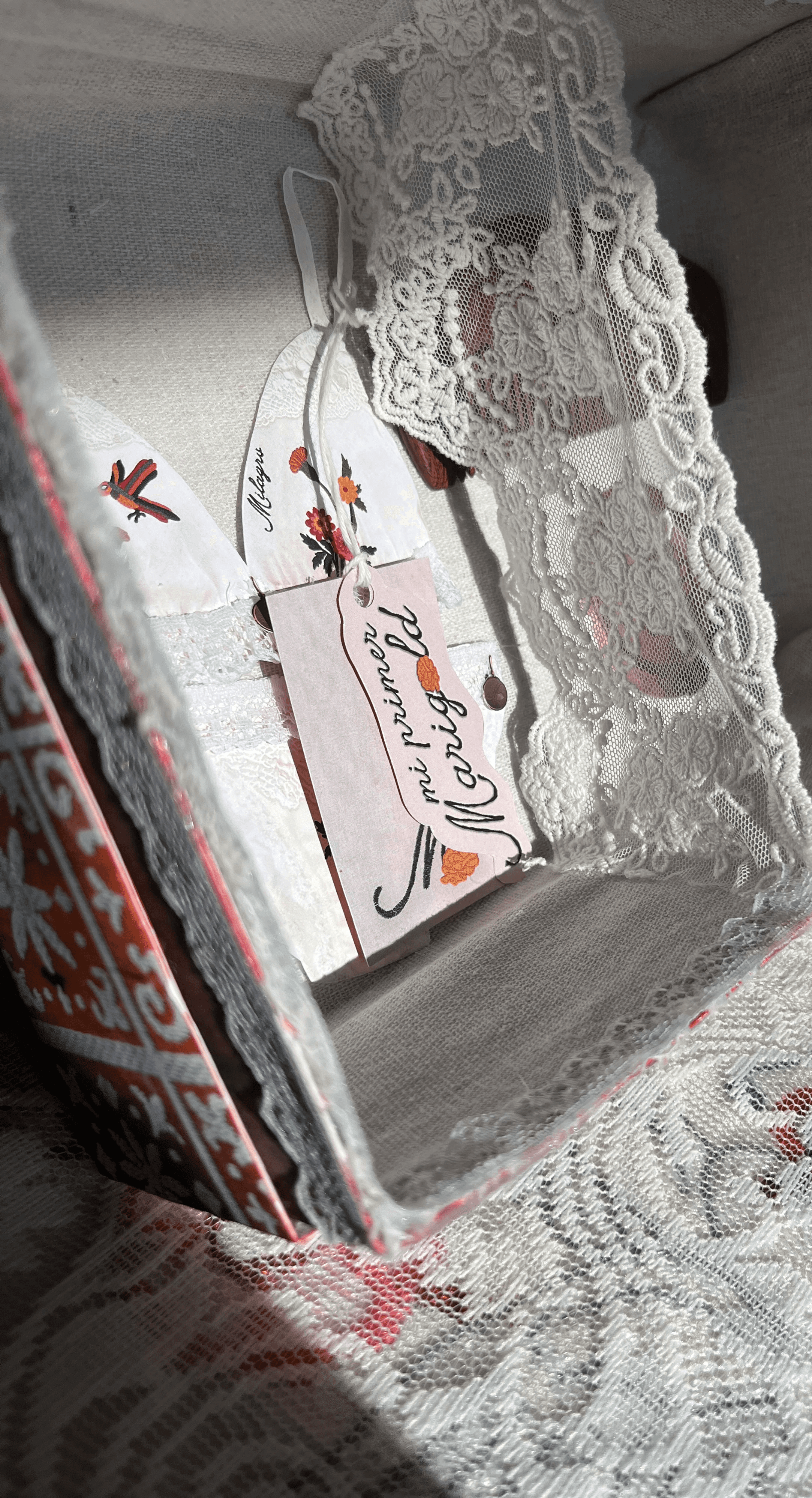 Inside, the contents are wrapped in linen fabric and separated with a lace divider, echoing the soft, worn textures often found in vintage household textiles. This not only adds to the overall aesthetic but also creates a more thoughtful and organized experience, separating the main product from additional pieces while reinforcing a sense of care, tradition, and longevity.