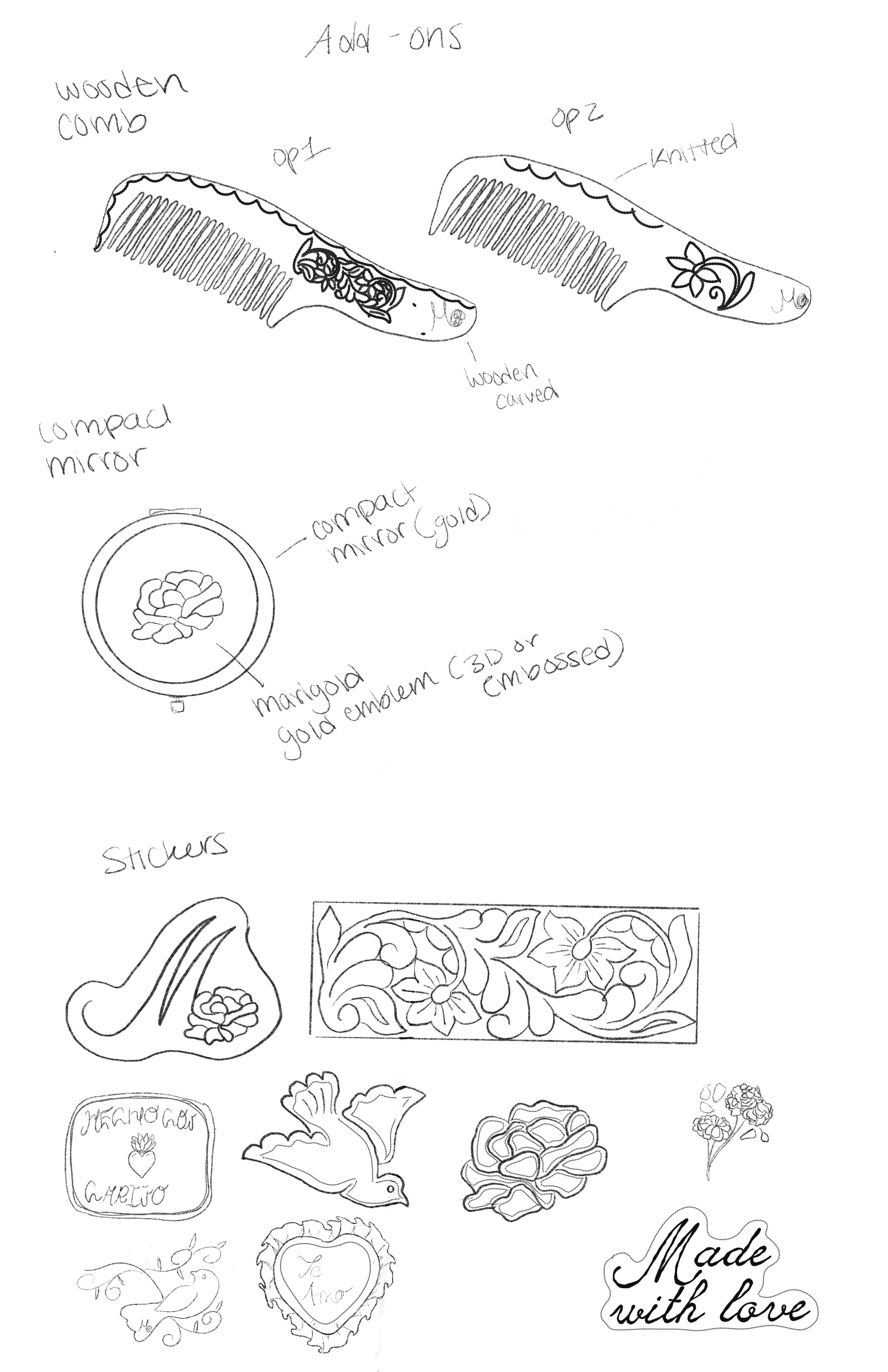 For the additional elements in my Marigold project, I included a vintage wooden comb engraved with the Marigold logo to maintain consistency within the branding. Beyond that, the comb carries cultural meaning—within Mexican households, it’s common for an abuelita or mother to gently comb a young girl’s hair. It becomes a quiet, intimate moment of care, patience, and connection.
