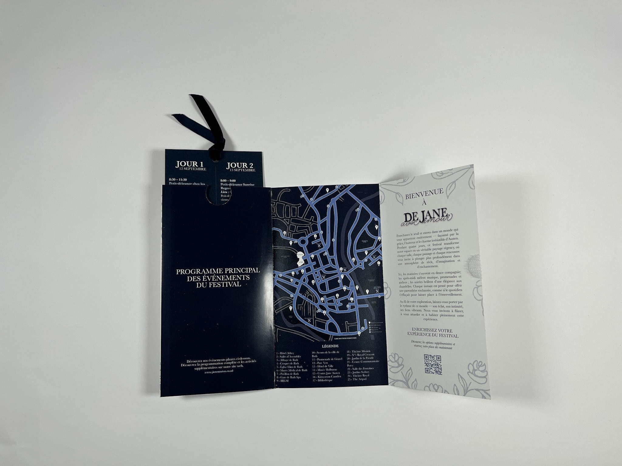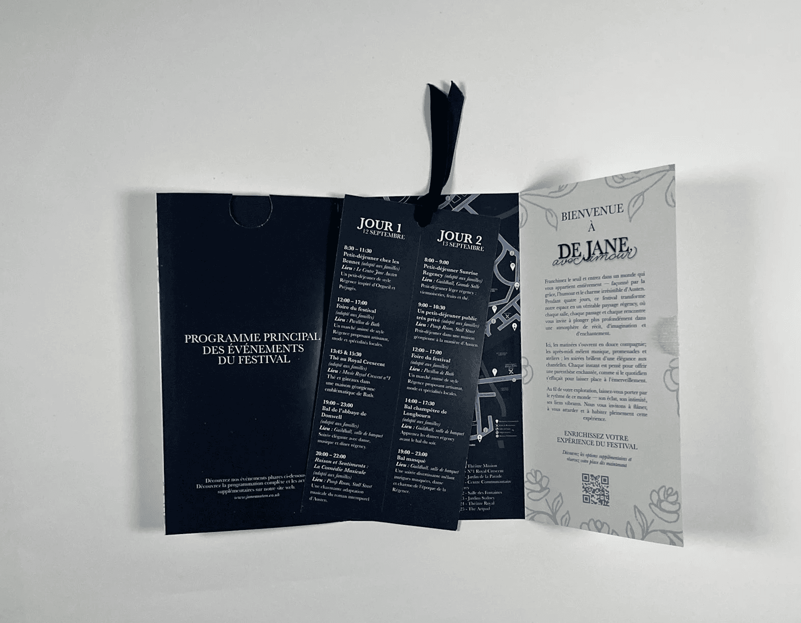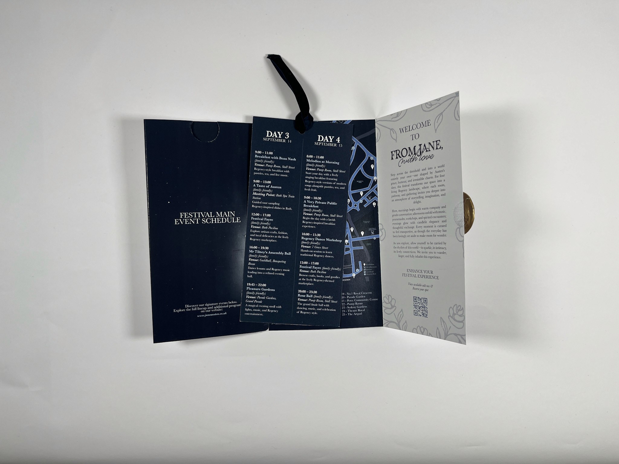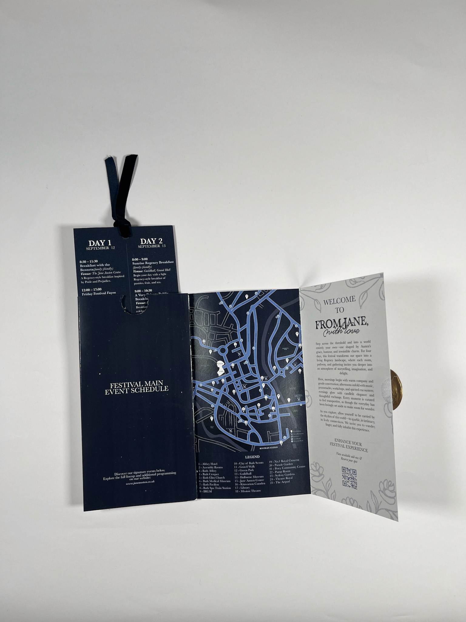 For the program, I focused on creating a thoughtful user experience from the moment it’s opened. Participants are greeted with a welcome message paired with the From Jane, With Love floral pattern, setting a refined Regency tone. To support easy navigation, I added a QR code for quick activity registration, a clear daily pull out schedule highlighting the five main events, and a simplified festival map with a legend so guests can find key locations easily.