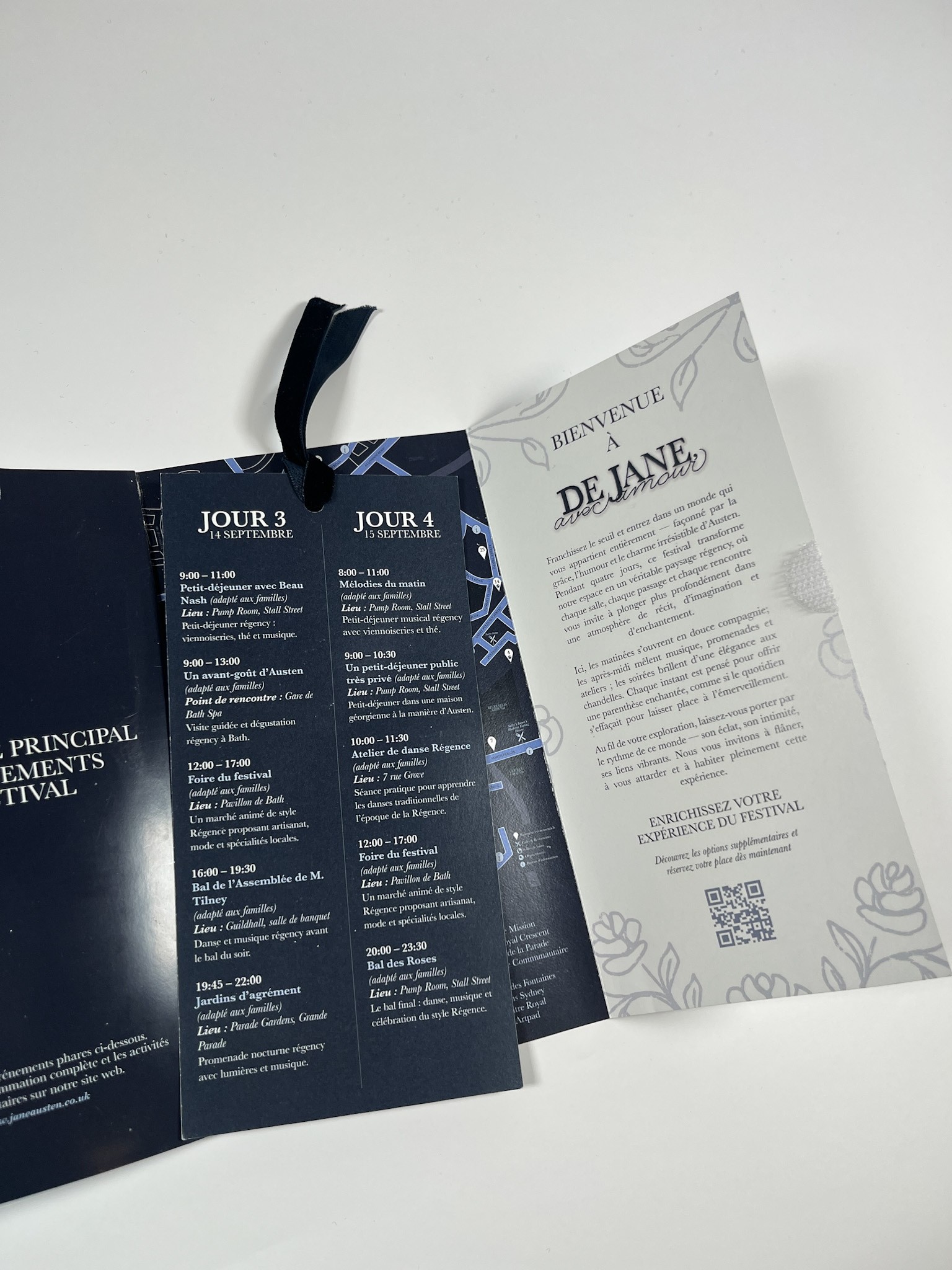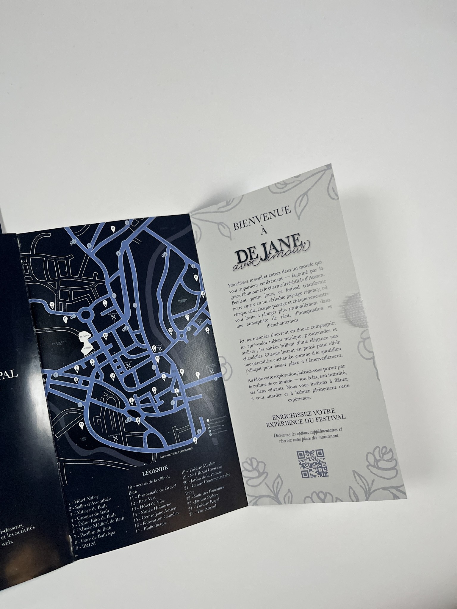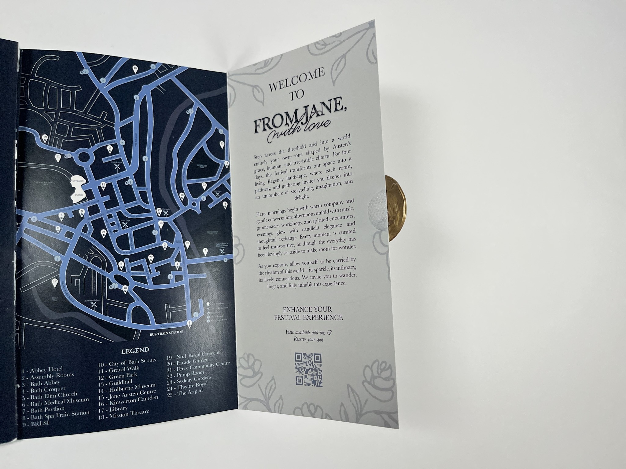 For the program, I focused on creating a thoughtful user experience from the moment it’s opened. Participants are greeted with a welcome message paired with the From Jane, With Love floral pattern, setting a refined Regency tone. To support easy navigation, I added a QR code for quick activity registration, a clear daily pull out schedule highlighting the five main events, and a simplified festival map with a legend so guests can find key locations easily.