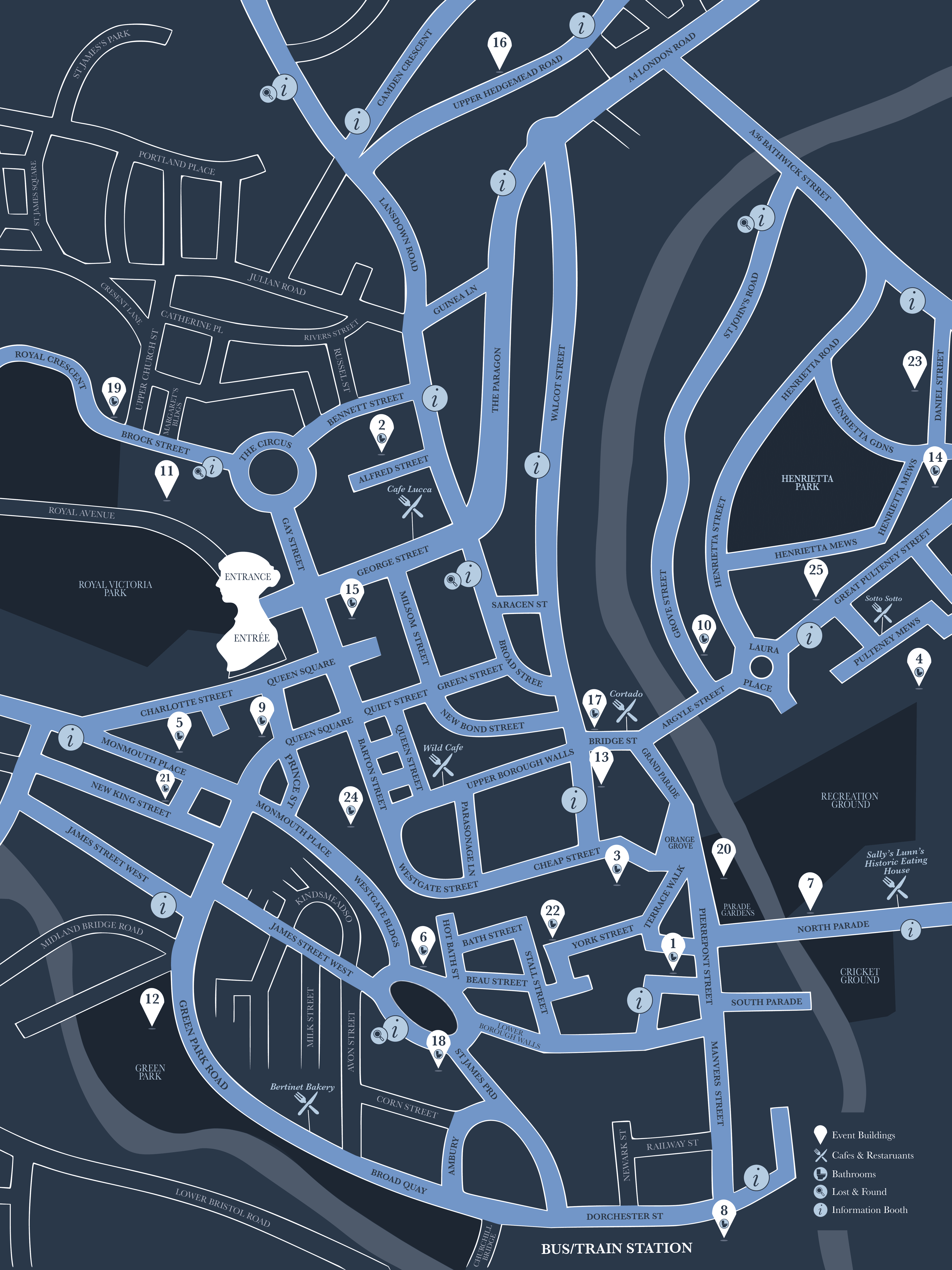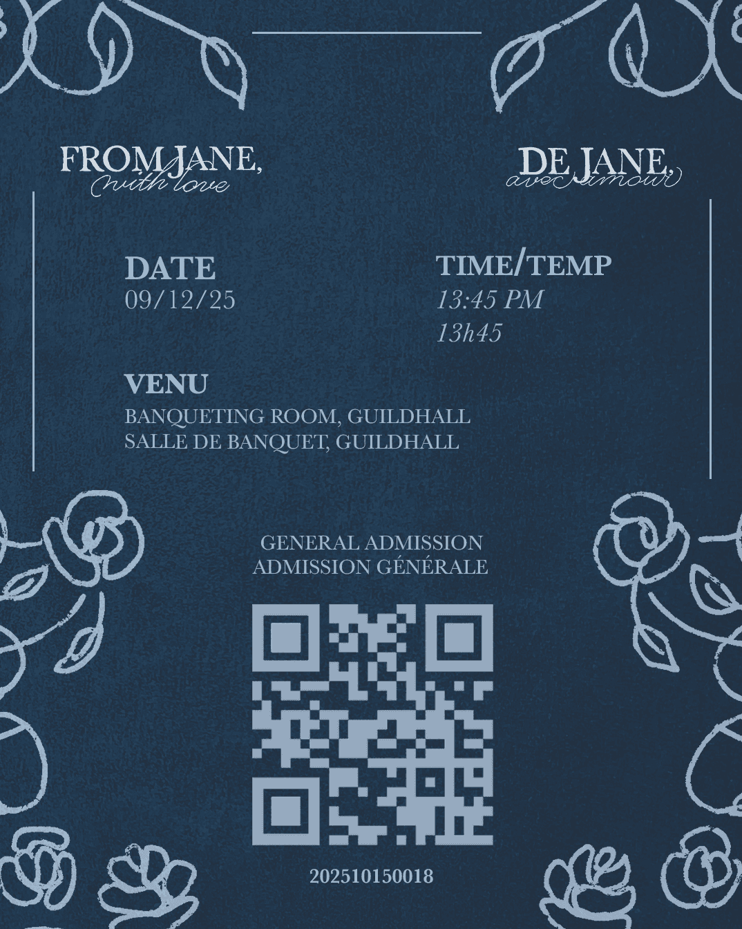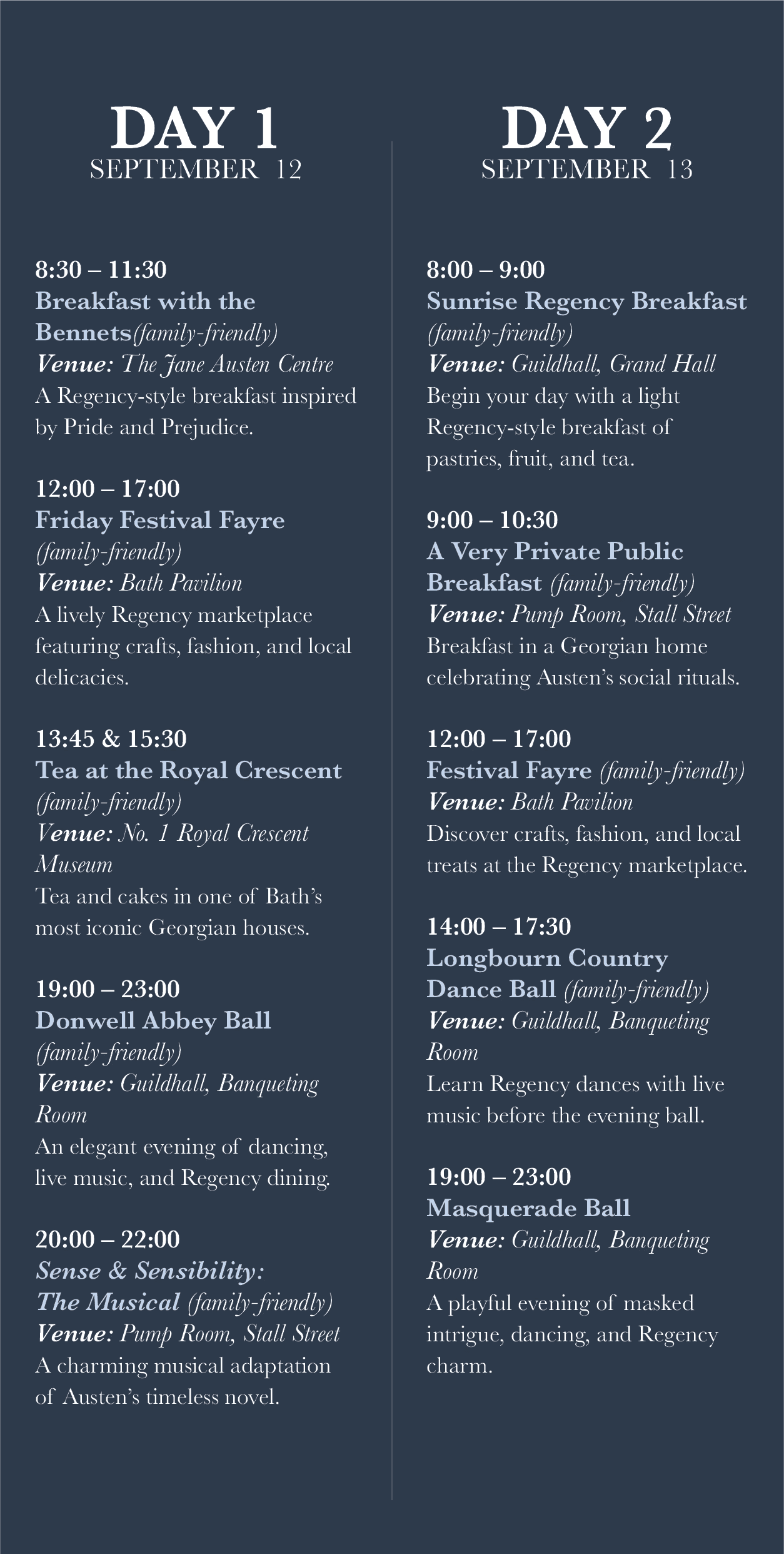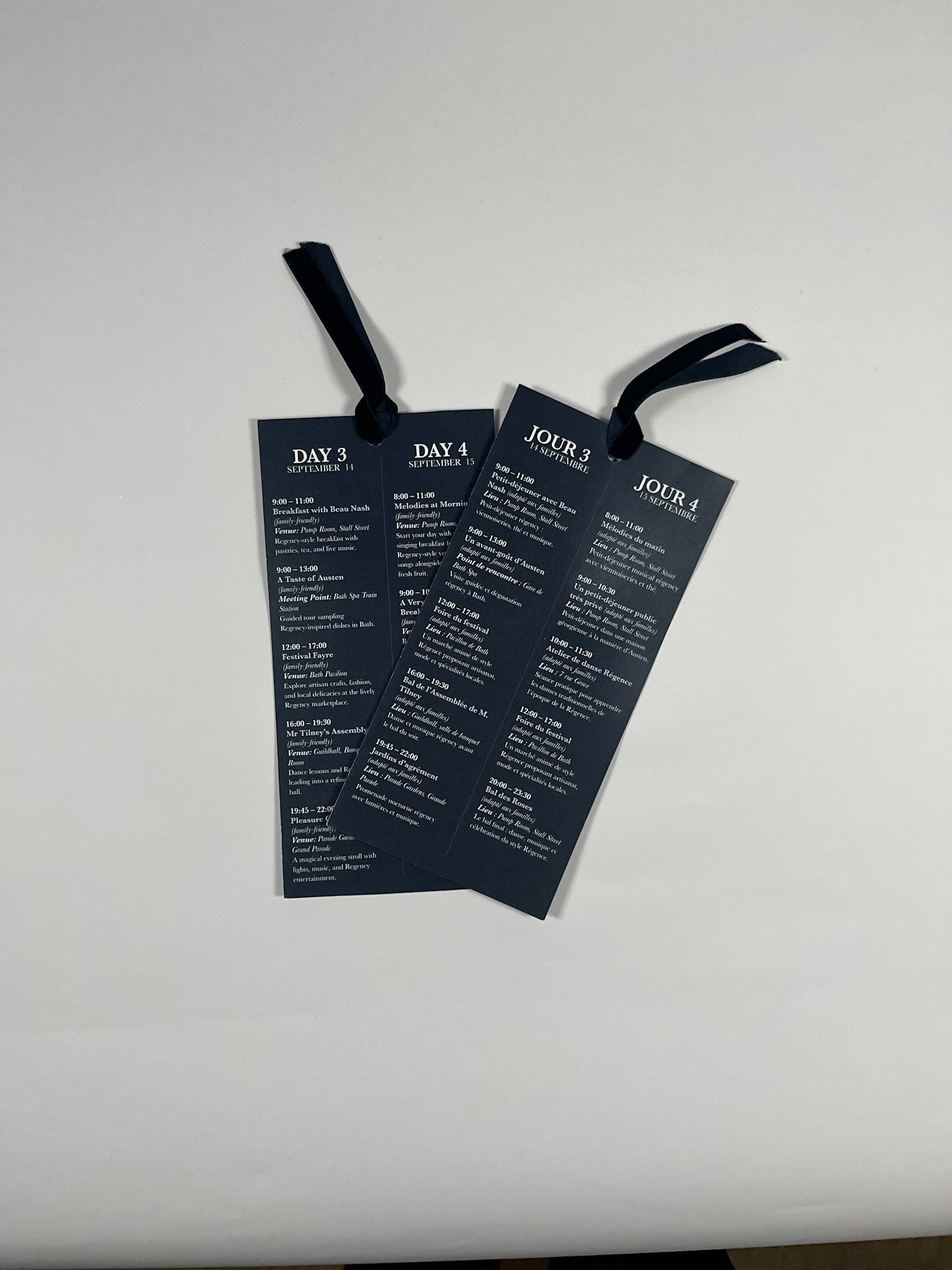 For the program, I focused on creating a thoughtful user experience from the moment it’s opened. Participants are greeted with a welcome message paired with the From Jane, With Love floral pattern, setting a refined Regency tone. To support easy navigation, I added a QR code for quick activity registration, a clear daily pull out schedule highlighting the five main events, and a simplified festival map with a legend so guests can find key locations easily.
