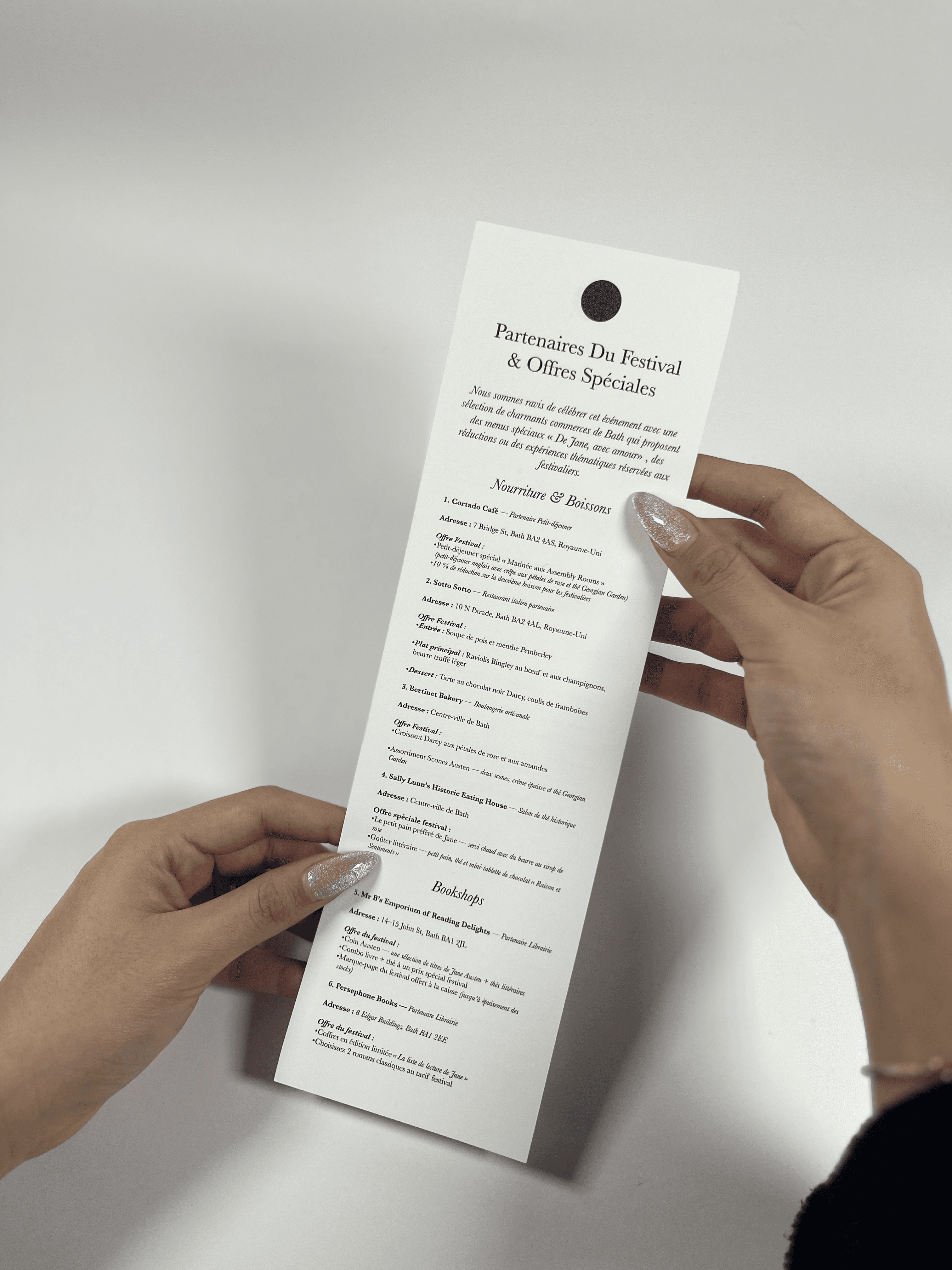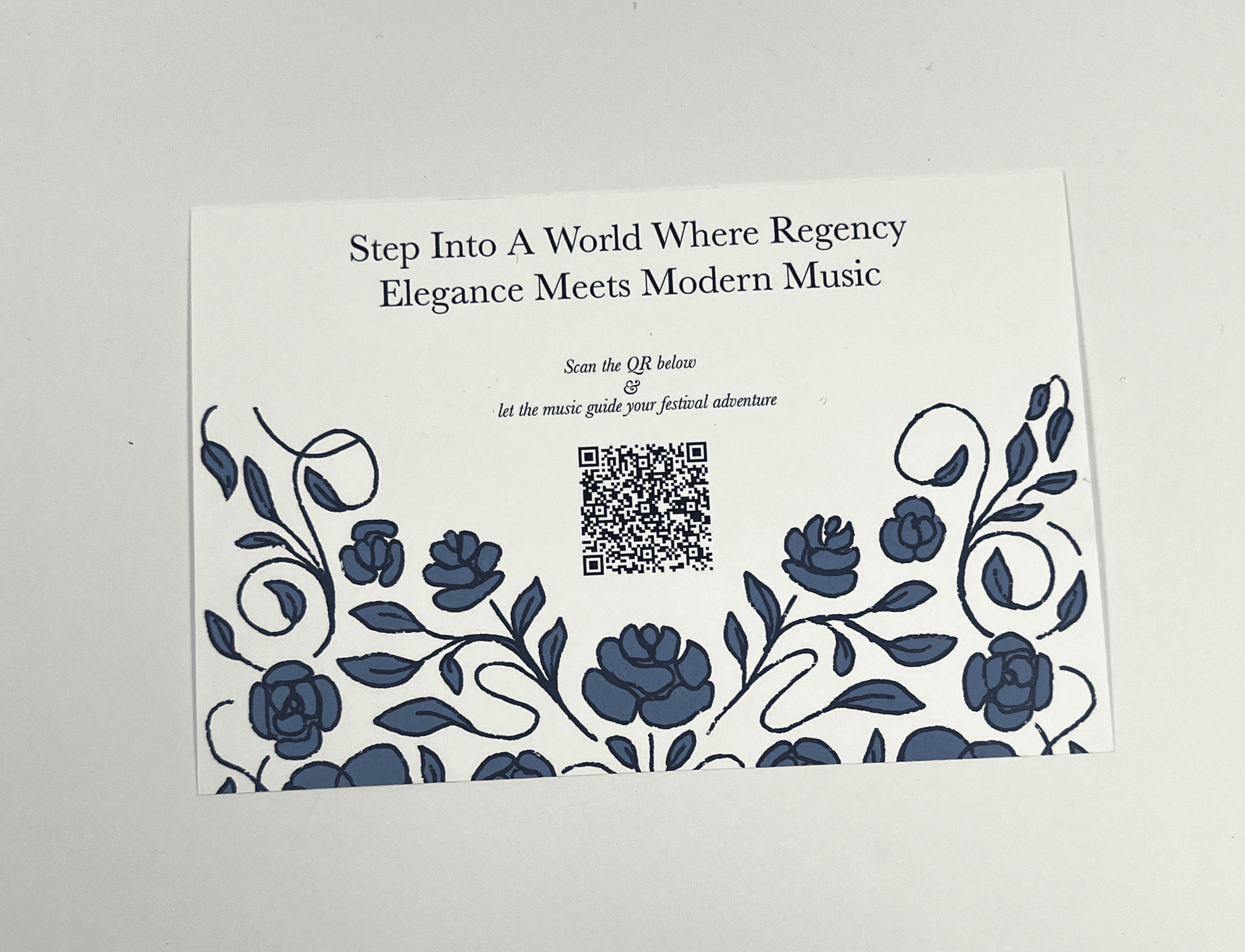 The Spotify card doubles as part of the welcome box. When scanned, it directs attendees to a pre-made playlist curated specifically for the festival. The playlist features modern orchestral music that blends contemporary sounds with Regency-era influences. Using modern tracks helps attendees feel connected while still evoking the elegance of the period.