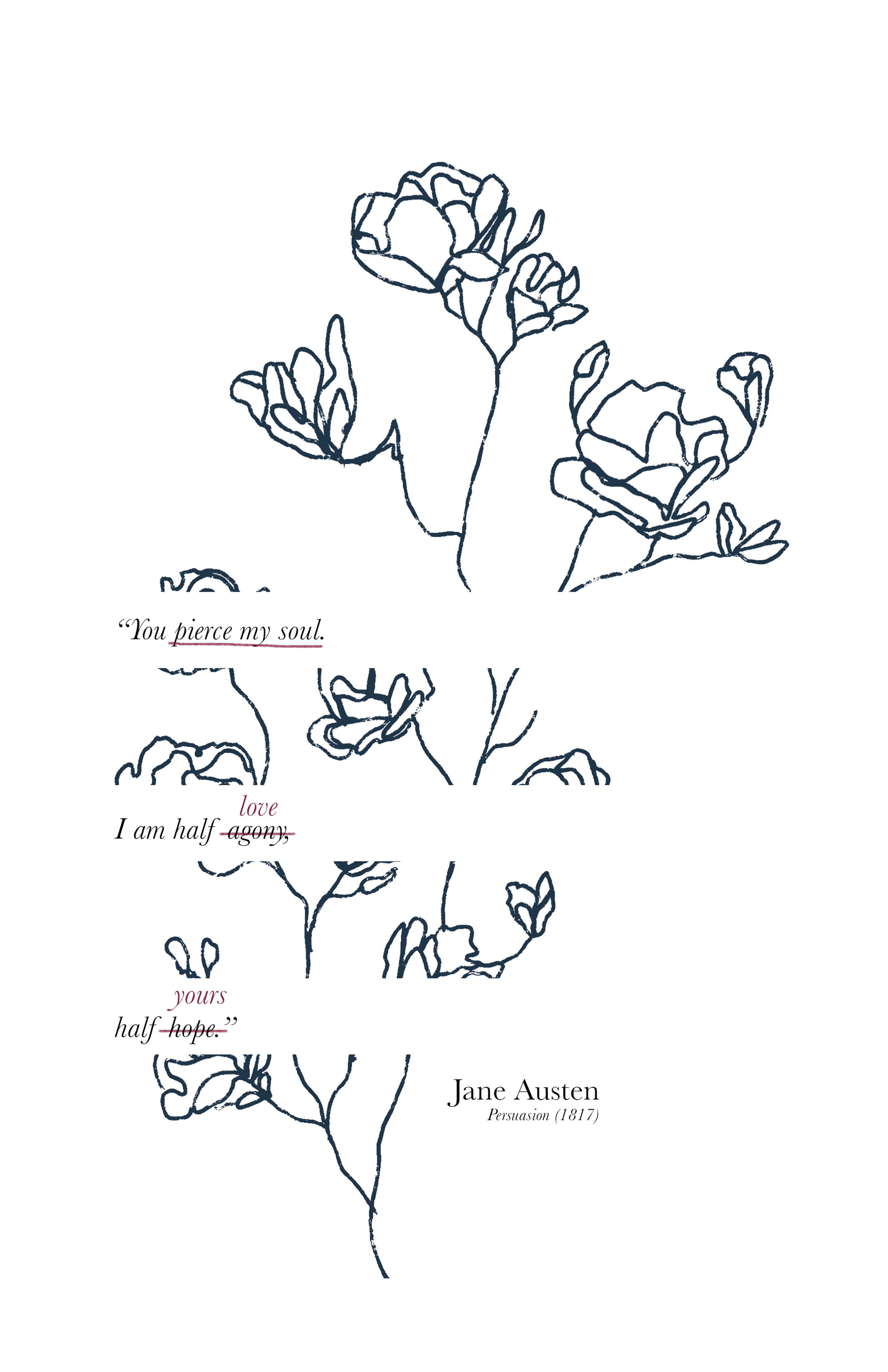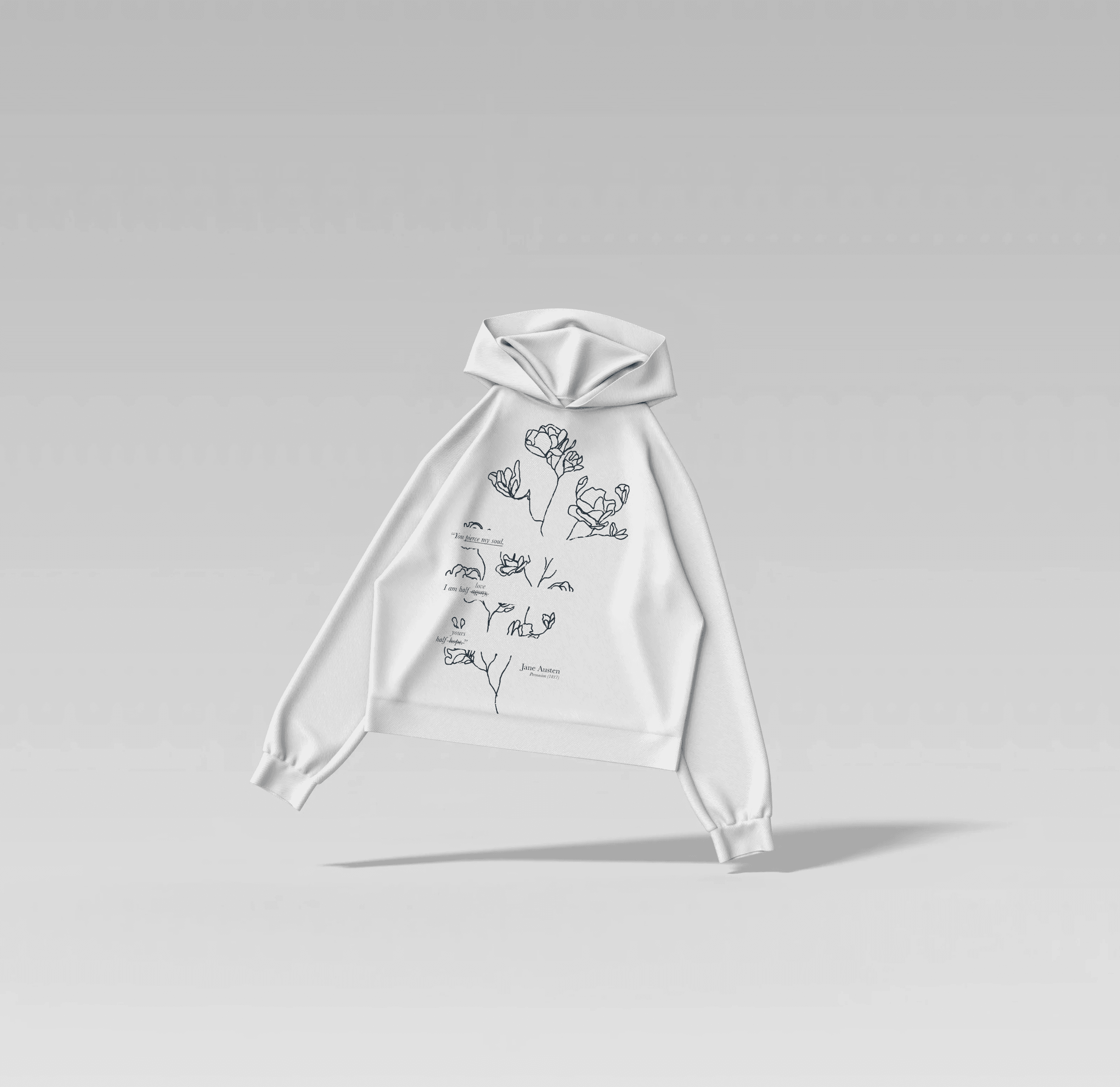 The hoodie features a reimagined quote from Persuasion (1870): “You pierce my soul. I am half agony, half hope,” adapted to emphasize connection, intimacy, and emotional vulnerability. In the design, “pierce my soul” is highlighted in red, while “agony” is crossed out and replaced with “love,” and “hope” is crossed out and replaced with “yours.”