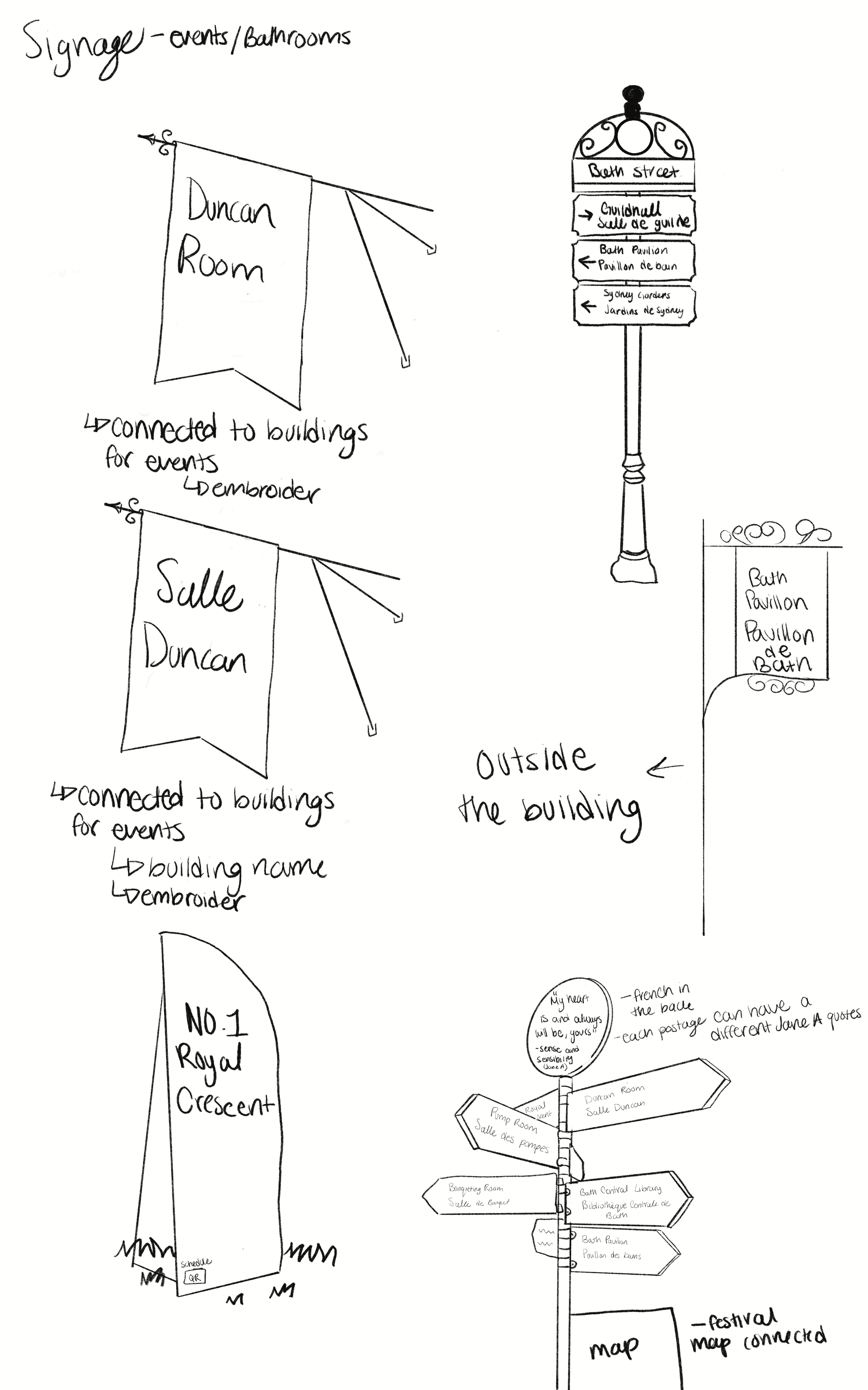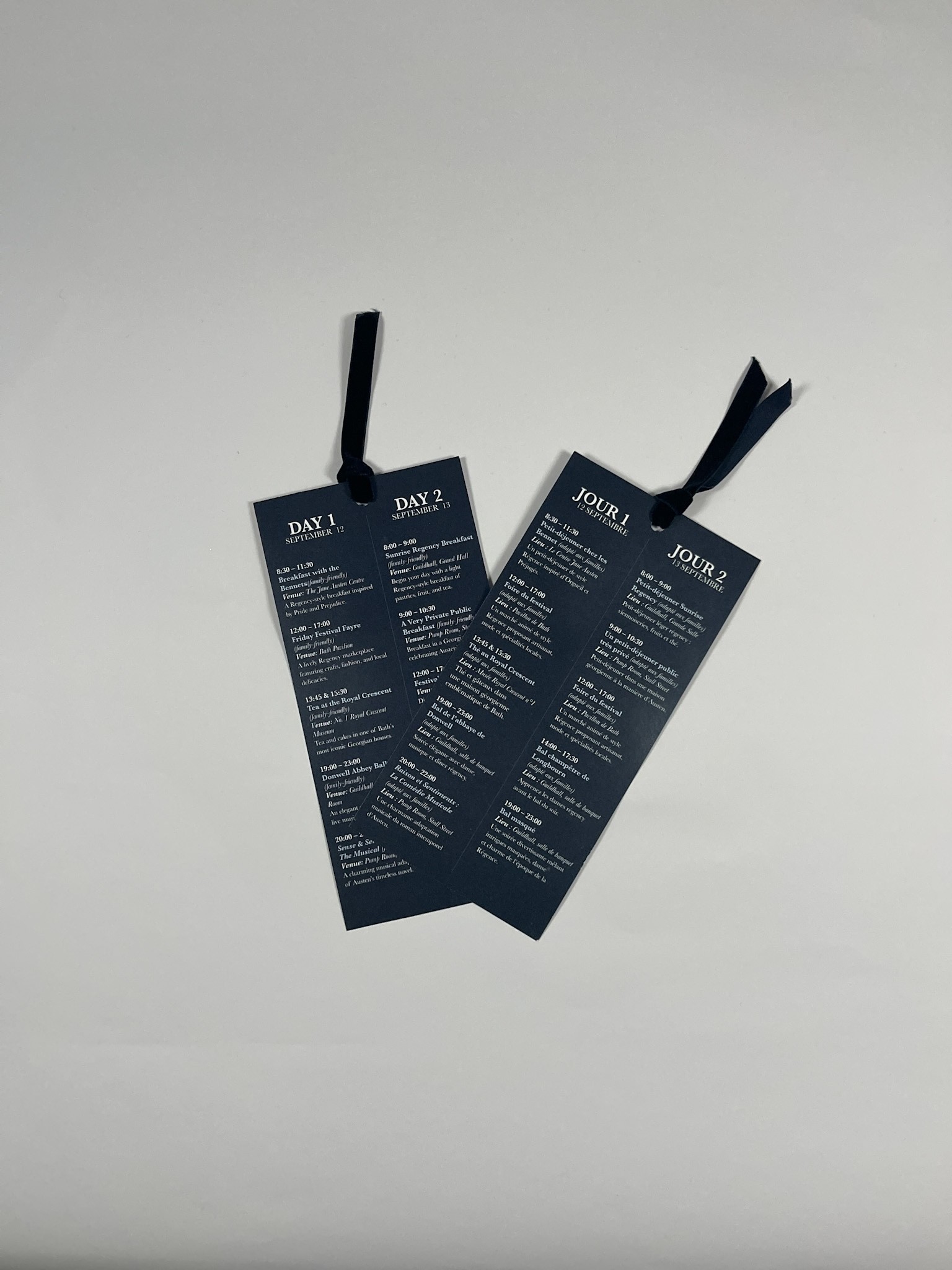I designed bold linen sashes for staff, vendors, and volunteers as an alternative to traditional lanyards. Their high visibility makes it easy for attendees to identify who to approach from a distance. The linen material reflects the importance of textiles in the Regency era and aligns seamlessly with the festival’s aesthetic. Each sash is finished with the festival crest at the bottom, reinforcing the Jane Austen theme throughout the event experience.